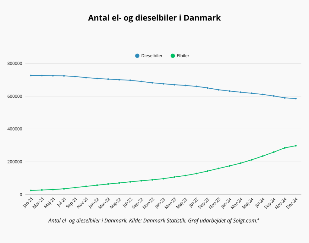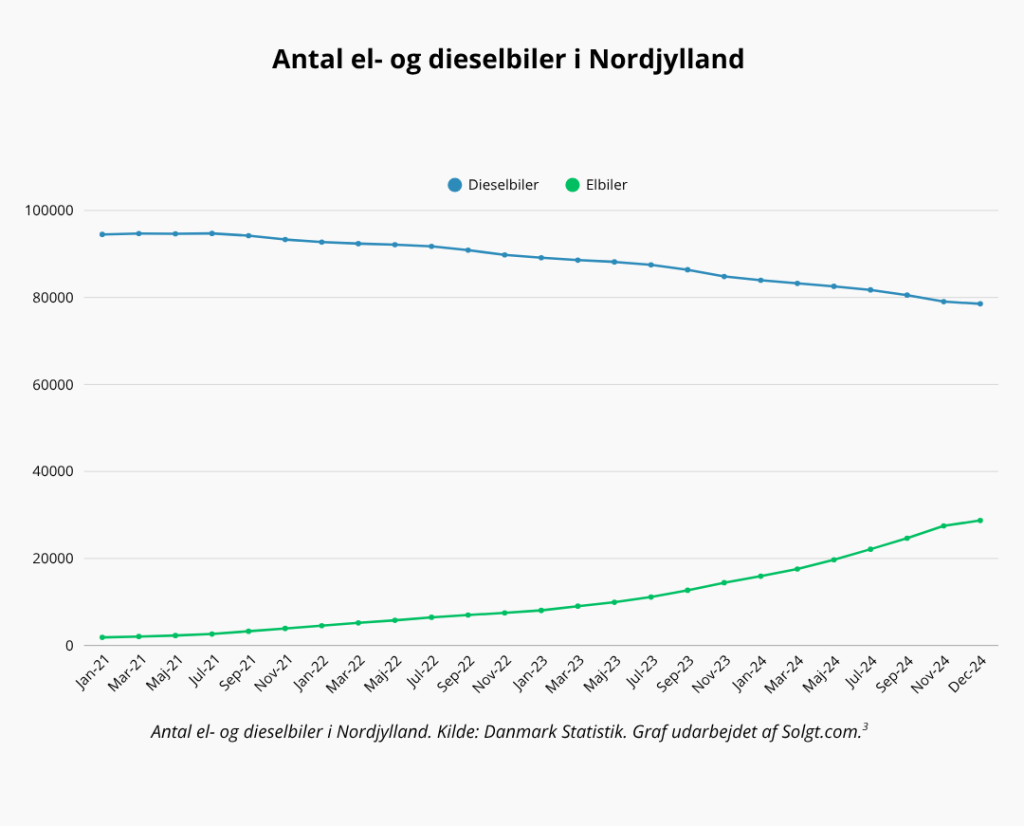 Denne tendens var allerede tydelig i 2023 og det hænger godt sammen med tal fra Danmark Statistik, der viser en tilbagegang af antallet af dieselbiler i Nordjylland. Fra januar 2021 til december 2024 er mængden af dieselbiler i regionen faldet med næsten 17 procent, hvilket afspejler en klar og vedvarende bevægelse væk fra fossile brændstoffer mod mere bæredygtige alternativer.3+4