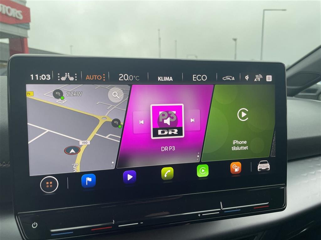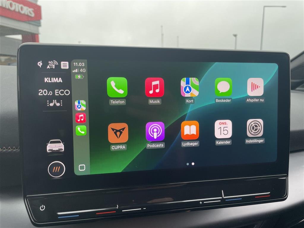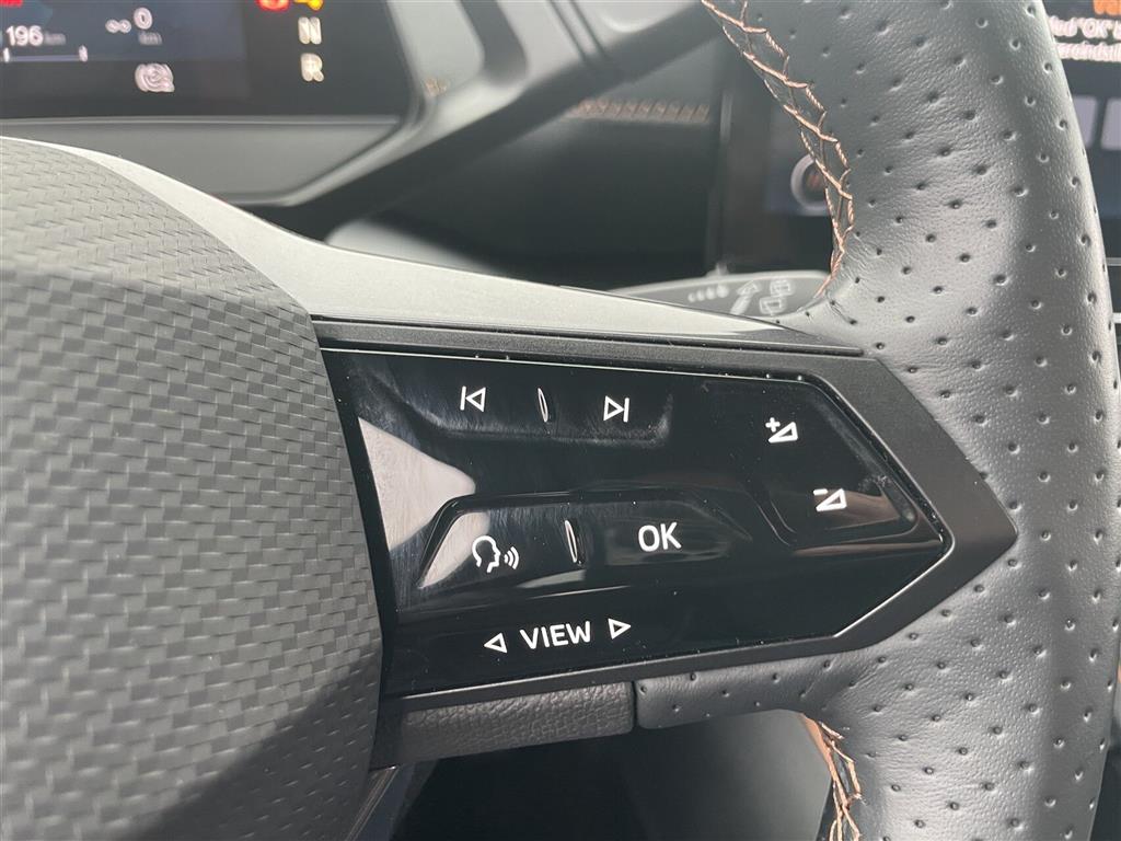 Touchskærm, 360¤ Around View Monitor, Apple CarPlay/Android Auto - Trådløs, Adaptiv Fartpilot, Auto light control, Automatisk op-/nedblænding, Bakkamera m. dynamisk guide, Bluetooth, CUPRA Connect (app styring) , Elektrisk håndbremse, El-indklappelige spejle m. varme, El-rudehejs for & bag, Fjernbetjent centrallås, Fuldautomatisk klimaanlæg, Head-up display, Håndfri telefon, Infocenter, i-pedal (intelligent speeder), Klimaanlæg 2-zoner, Kørecomputer, Multifunktionsrat, Musikstreaming via bluetooth, Navigation, Nøglefri betjening, Nøglefri døre, Nøglefri start, Parkeringssensor for & bag, Parkeringsassistent, Ratbetjent DAB+ Radio, Regnsensor, Sædevarme for, Trådløs mobilopladning, USB C stik, Udvendig temperaturmåler, Valgbare køreprogrammer, 19" Alufælge, Blink i sidespejlene, Fuld LED forlygter, Hajfinne antenne, Indfarvede kofangere, LED baglygter, LED kørelys, Metallak, Mørktonede ruder bag, Tågelygter, 4-vejs justérbart vegansk læderrat m. varme, Armlæn, Bagagerumsdækken, Digital instrumentering, Dobbelt bund i bagagerum, Højdejusterbart førersæde, Kopholder, LED Ambientlight - Justérbar, Splitbagsæde, ABS, Airbags, Automatisk nødbremsesystem, Blindvinkelsassistent (Blind Spot Detection), E-Call, ESP, Førerovervågning med advarsel, Intelli. hastighedsassistent, Isofix, LDWS (Lane Departure warning System), LKAS (Lane Keep Assist System), PCA - Aktiv Parkeringskollisionsassistent, RCTA - Advarsel ved krydsende trafik bag, Skiltegenkendelse, Træthedsregistrering, Vognbaneskiftassistent