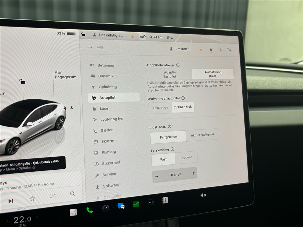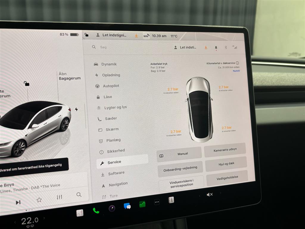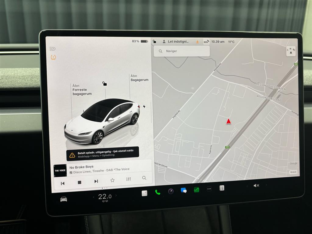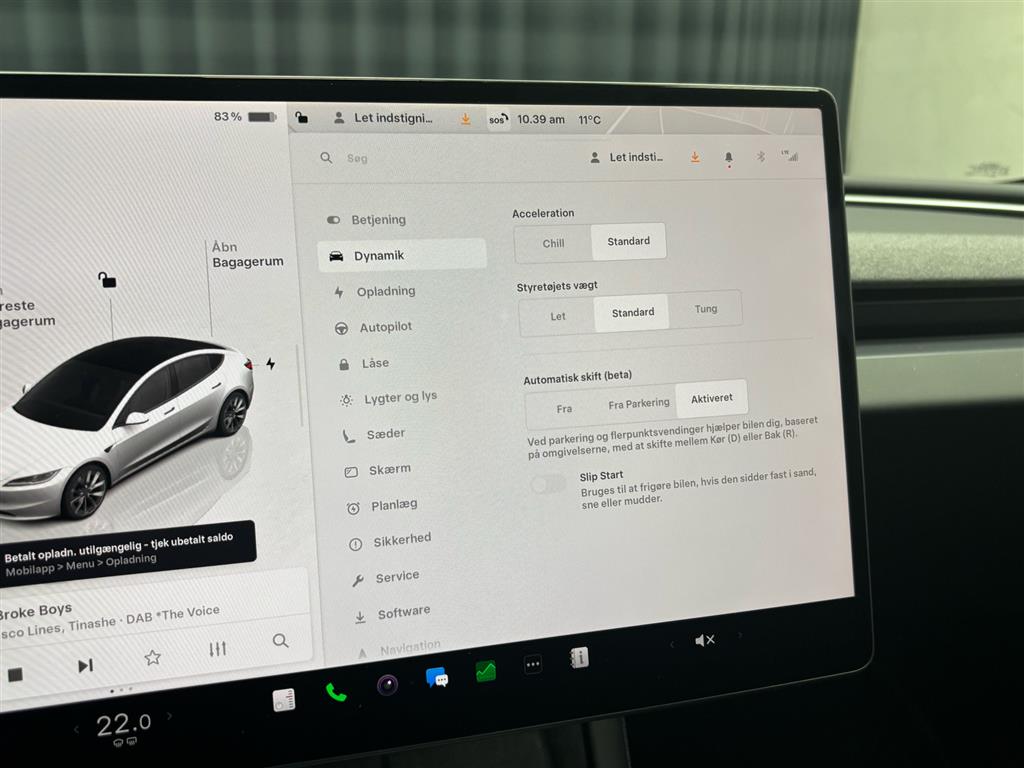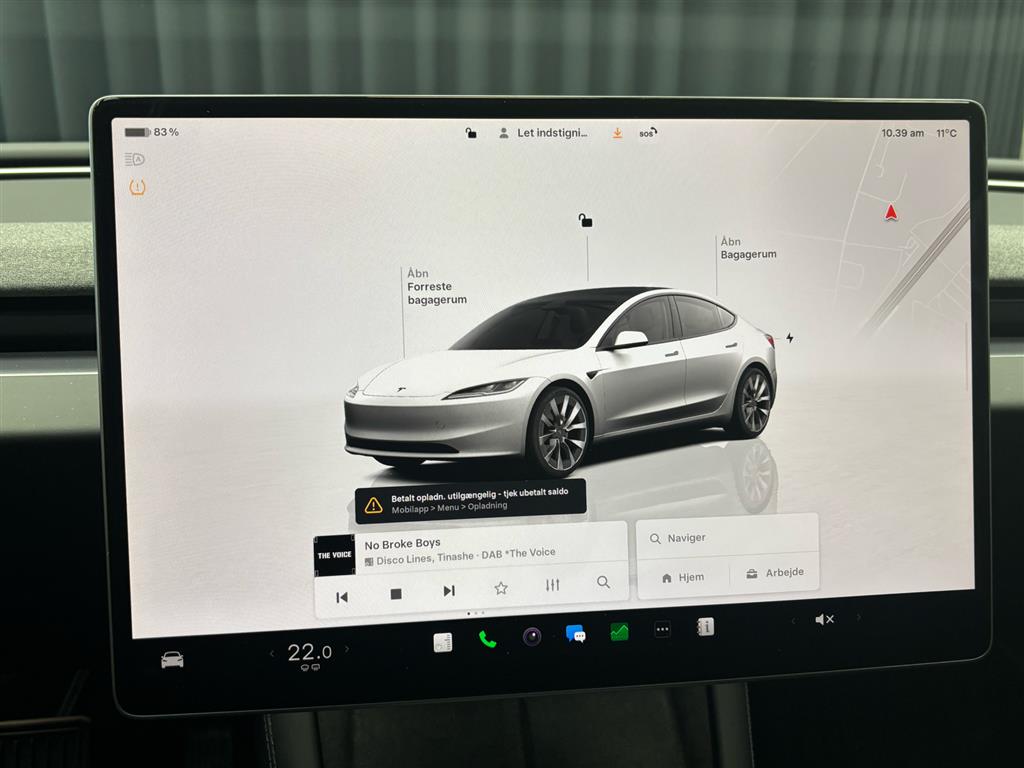 Hjemmeladning: 11 kw (ca. 6 timer)