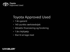 4 x el-ruder, Adaptiv fartpilot, Android Auto, Apple CarPlay, App Styring af Klimaanlæg, Auto. nedbl. bakspejl, Automatgear, Automatisk Lysstyring, Automatisk op-/nedblænding, Bakkamera, Bluetooth, Digital instrumentering, El indst. førersæde, Elektrisk bagklap, El-foldbare spejle m. varme, El-håndbremse, Elruder for, Elruder for/bag, Fjernbetjent centrallås, Håndfri telefon, Infocenter, Klimaanlæg 2-zoner, LED Lygter, Læderrat, Multifunktionsrat, Musikstreaming via bluetooth, Navigation, Navigation via Apple carplay/Android Auto, Nøglefri døre, Nøglefri start, Parkeringssensor bag, Parkeringssensor for, Radio, Regnsensor, USB-C stik, Varme i forruden, 18" Alufælge, Fuld LED forlygter, LED Baglygter, LED forlygter, LED kørelys, Mørktonede ruder bag, Tagræling, 10,5" Multimedieskærm, Armlæn, Højdejusterbart førersæde, Højdejusterbart passagersæde, Justerbart rat, Kopholder, Rat m. varme, Stofindtræk, Airbag, ABS, Automatisk nødbremsesystem, Dæktrykssensor, ESP, Isofix, Lyssensor, Toyota Safety Sense, Træthedsregistrering, Vejbaneassistent, Vognbaneovervågning, Skiltegenkendelse